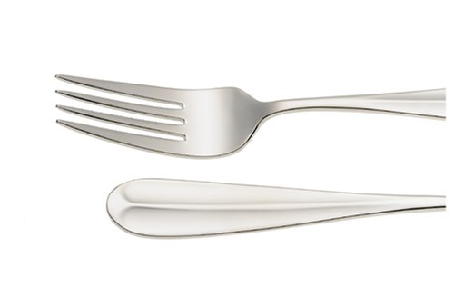 Simple and bold, Patriot sets a very forthright table. Handles flow from a very narrow neck to rounded tab ends, and are emphasized by a raised, central rib. The knife is especially dramatic, with its pronounced shoulder and long curved blade that widens into a rounded butter-knife-style end instead of tapering to the more usual point. This is a knife that holds its own with oversized dinner plates. Made of mirror-polished 18/10 stainless-steel, the moderately priced flatware is nicely balanced and exhibits a medium-weight heft.