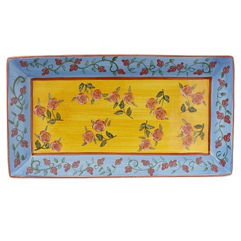 Set the table with the sun-drenched hues of the Provence region of France. This rectangular platter features a duo of floral patterns in sunflower gold, olive green, spicy orange and sky blue. With a hand-painted, brushed finish, it offers countless possibilities for matching napkins, candles and centerpieces. Coordinating Provence dishes includes dinner plates, salad plates, mugs and bowls (each sold separately or in sets). Earthenware. Microwave and dishwasher safe. Made in USA. 10Lx18-1/2W". Read more...